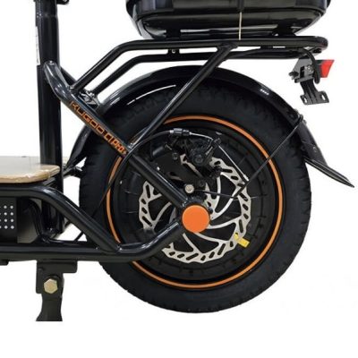 Одно из основных преимуществ модели – наличие передней корзины и небольшого кофра на задней части. Также стоит отметить большой и яркий дисплей с четким шрифтом, что упрощает использование. Управление осуществляется кнопками и переключателями на руле: включение света, поворотников или звукового сигнала требует лишь одного движения пальцем. Низкая рама облегчает посадку, так как не нужно высоко поднимать ногу. Эта модель прекрасно подходит людям разного роста, поскольку сиденье и руль регулируются по высоте. Дополнительный комфорт во время поездки обеспечивают два передних амортизатора и пружины в конструкции сиденья. За безопасность отвечают дисковые механические тормоза.