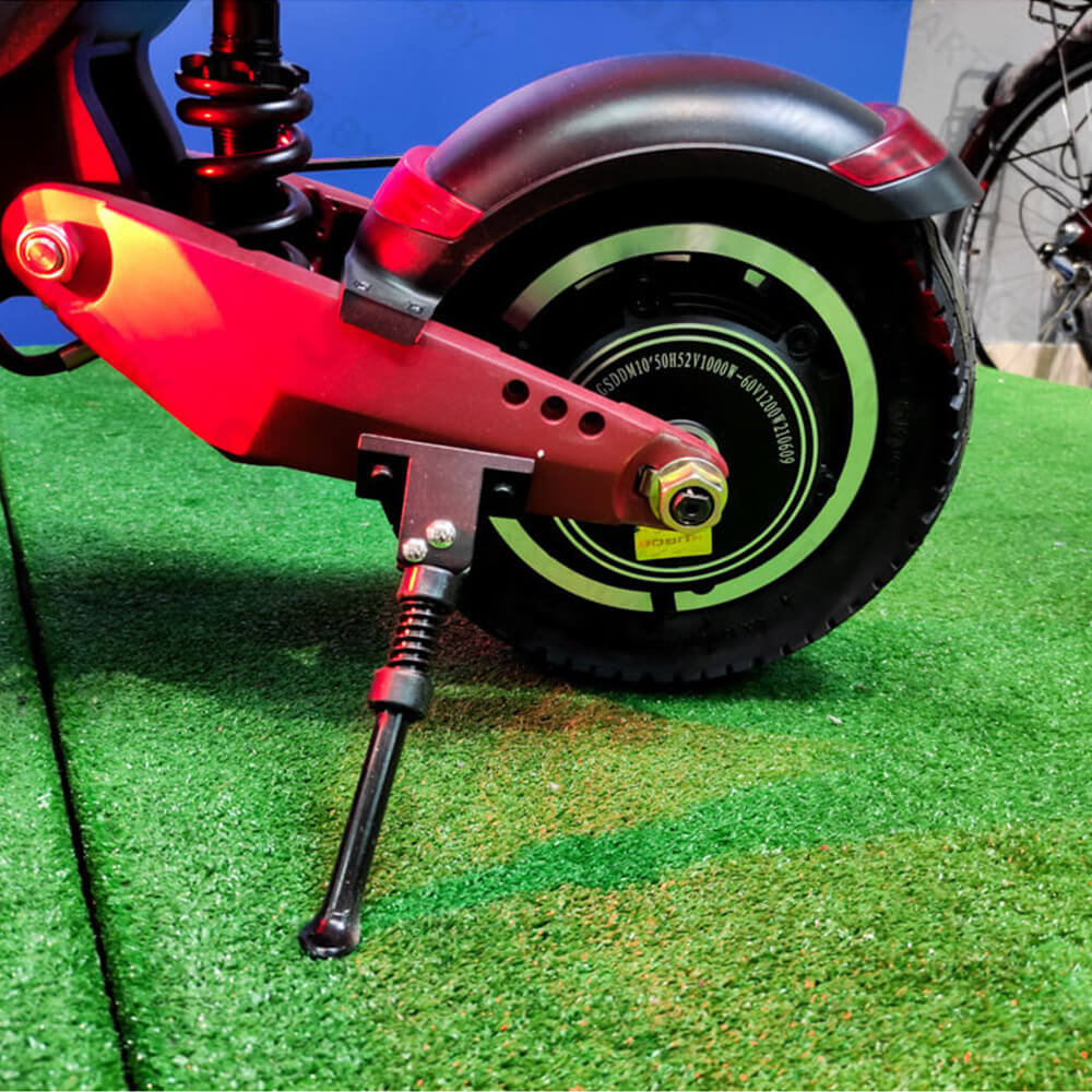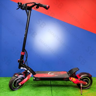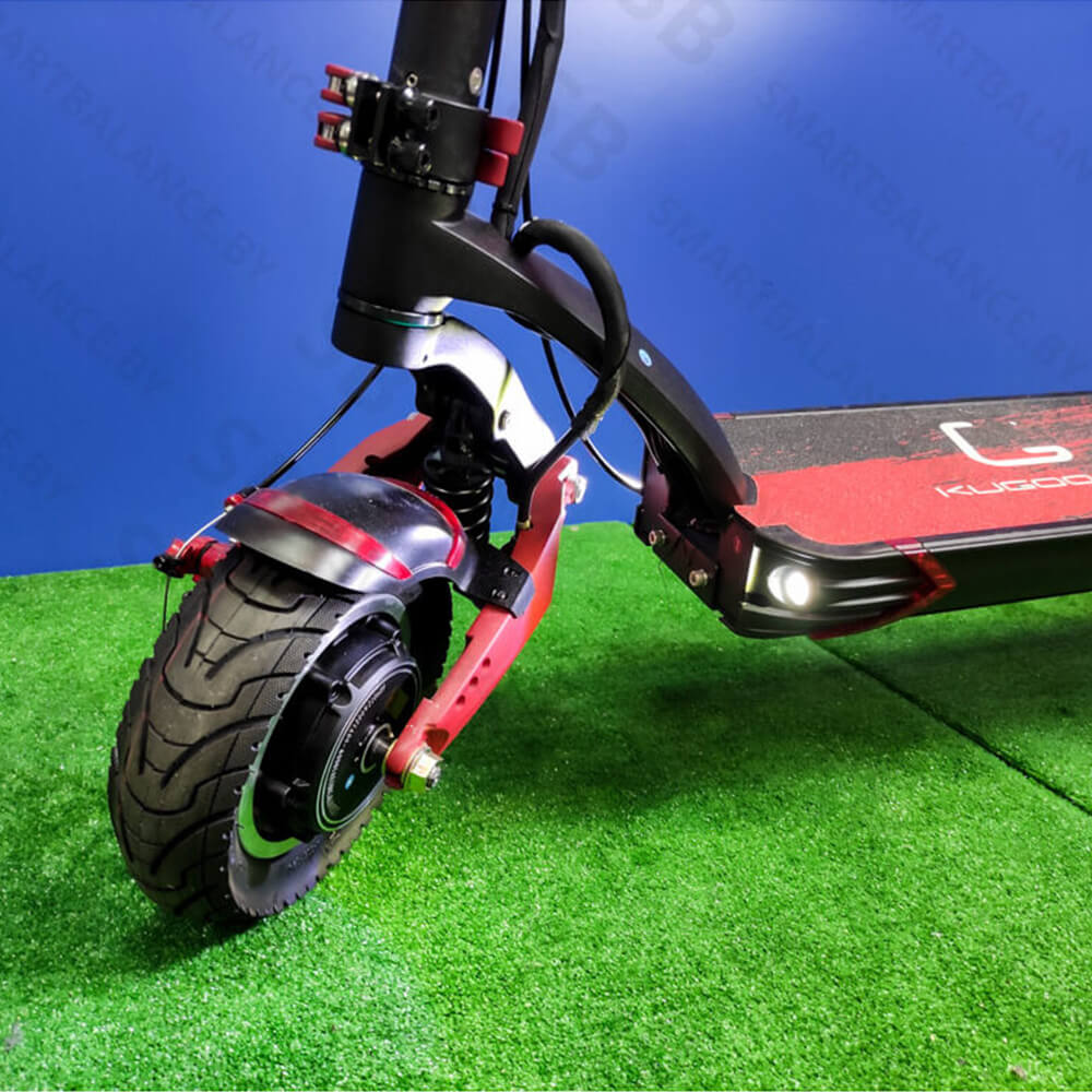 Электросамокат Kugoo G1 (Jilong) – это полноприводный внедорожник, отлично приспособленный для российских дорог. Он мощный, быстрый и надёжный. Ездить по любым, даже самым неровным дорогам, можно с комфортом, благодаря 10-дюймовым колёсам, и приподнятой деке, которые образуют высокий клиренс, чтобы преодолевать препятствия. А инновационная система амортизаторов наряду с пневматическими колёсами смягчают езду, поглощая вибрацию и тряску. У Куга Джи 1 два мотора, каждый по 1000 Ватт, что в совокупности даёт общую максимальную мощность 2000Ватт. Поэтому эта модель легко справляется с нагрузками, типа подъёма, высокой скорости, веса. Кстати, разогнаться этот зверь может до 24 км/ч.