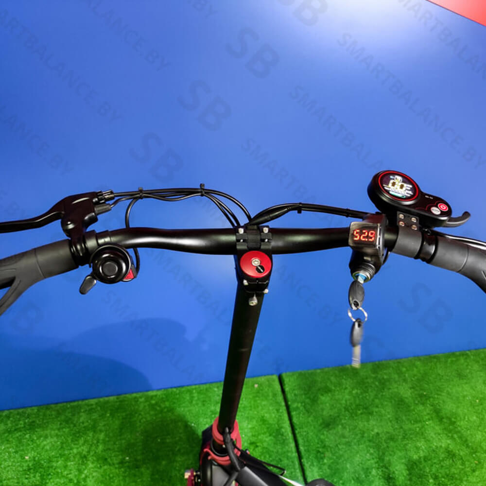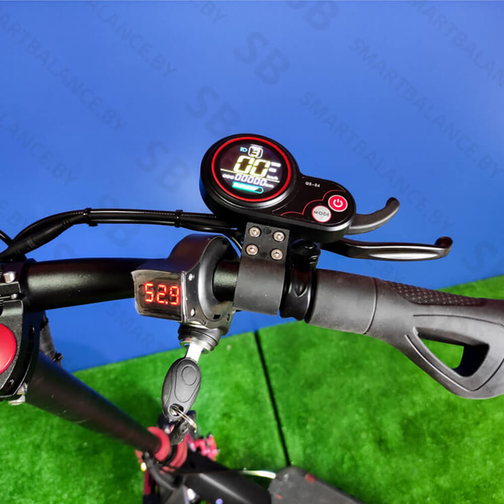Проехать на одном заряде можно до 60 км, в зависимости от условий эксплуатации. Все параметры, типа скорости, пробега, заряда батареи, режима езды, можно отслеживать на дисплее, расположенном на руле. Там же находятся рычаги от двух тормозов, курок газа, кнопка вкл/выкл подсветки, кнопка переключения режима езды, кнопка выключения одного мотора.