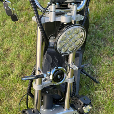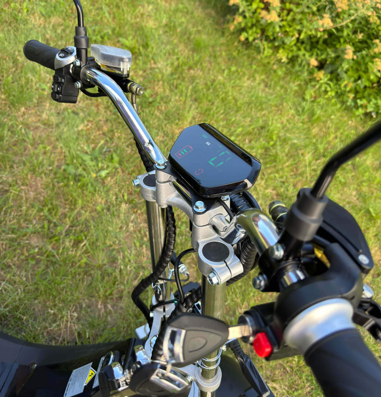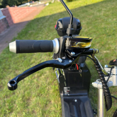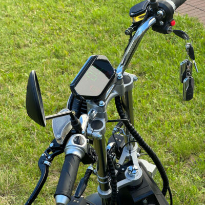 На руле электроскутера расположен большой экран бортового компьютера, на котором отображается вся необходимая информация о поездке: скорость движения, уровень заряда батареи и другие параметры.